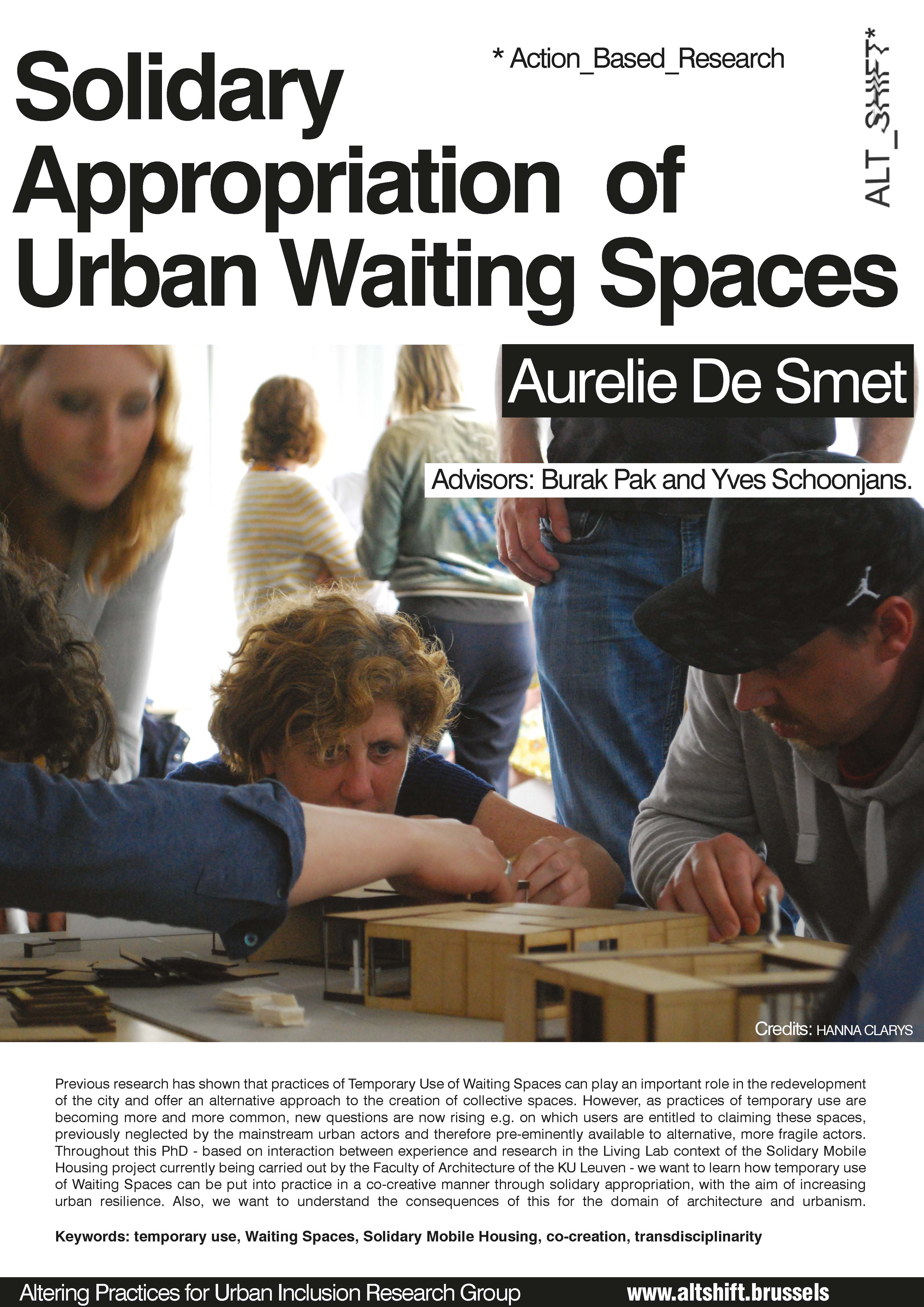 Throughout this PhD - based on interaction between experience and research in the Living Lab context of the Solidary Mobile Housing project currently being carried out by the Faculty of Architecture of the KU Leuven - we want to learn how temporary use of Waiting Spaces can be put into practice in a co-creative manner through solidary appropriation, with the aim of increasing urban resilience. Also, we want to understand the consequences of this for the domain of architecture and urbanism.
